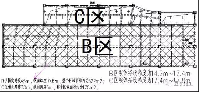 ②、B区及C区:B区位于A2地下车库入口处,该范围内基础为车道面,该范围内存在局部放坡,但坡度较缓。该区域基顶标高为194.65m~197.85m,在标高为204.00m、208.45m处存在拉梁结构,在212.05m处为结构顶板,因此该区域高支模高度约为14.2m~17.4m。C区位置紧邻B区车道,该位置处为弧形车道范围内,架体底部位于边坡上,且边坡上标高为197.85m~198.20m,坡度变化不是很大,区域较小,在标高为204.00m、208.45m、212.05m处为架空层,在215.65m标高位置处为结构板,因此C区高支模范围为17.4m~17.8m左右。B区横向跨度为45m,纵向跨度为10.6m,C区横向跨度38m,纵向跨度5m,B区和C区总共700㎡;具体区域位置详下图: