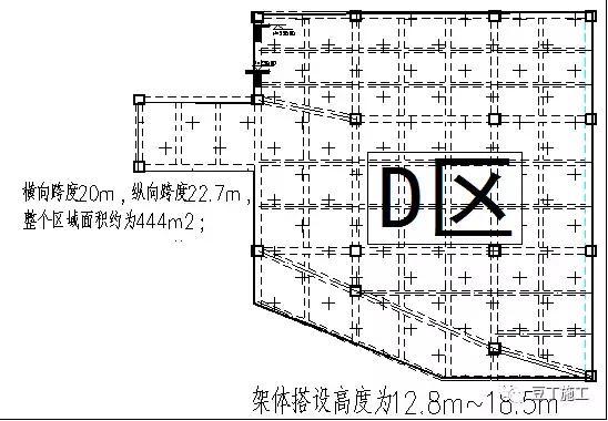 ③、D区:该区域位于6#楼南侧架空区,由于地形条件限制,该范围内基础多位于边坡上;架体搭设前,该区域需要进行平场,平场后标高范围约为212.3m~218.00m;根据设计要求,该范围内为架空层,在215.65m、219.25m、222.85m、226.45m标高处设置了拉梁结构,在标高为230.80m处为结构顶板,因此该范围内高支模搭设高度为12.8m~18.5m。该区域横向跨度为20m,纵向跨度为22.7m,整个区域为面积444㎡。具体区域位置详下图: