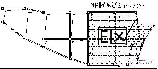 ④、E区:该区域位于6#楼南侧花街,该区域下层基础标高为-33.05(209.4m),在标高为215.65m处存在结构板,即该层高支模搭设高度6.1m,而下一层结构板标高为222.85m,因此该层高支模搭设高度为7.2m,具体区域位置详下图: