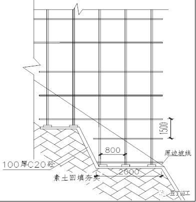 F区:由于整个F区位于边坡上,且该区域部分拉梁取消,高支模支设高度不是很高,因此,只需在其地梁施工完成,将其表面进行夯实,切出架体立杆位置,然后进行夯实,在其表面上铺设通长脚手板。