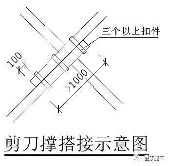 5)剪刀撑斜杆件的接长区域,应等间距设置3个旋转扣件进行搭接,搭接长度应大于1米,端部搭接扣件距离杆件端头的距离应大于100mm,不得采用对接扣件;剪刀撑斜杆和立杆或水平杆交叉时,交叉点应用旋转扣件进行固定。