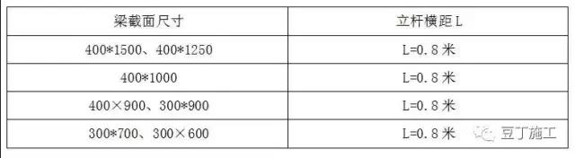 1)、主梁梁底增加1道承重立杆,次梁梁底根据实际情况隔一跨增加1道承重立杆,采用的钢管类型为483.6。承重立杆的步距 h=1.50米(即与满堂架水平杆连接成整体),立杆的横距L根据梁截面尺寸调整,详见下表: