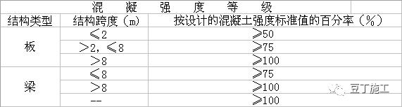 2、模板及其支架在拆除时混凝土强度要达到如下要求(表2)。