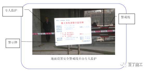 (8)整个拆除施工过程中地面必须设置安全警戒线,警戒范围为当日上午或下午计划待拆区域正下方以外5~10米范围及塔吊吊运区域,设专人看守,防止任何人员进入拆卸区范围,确保安全。