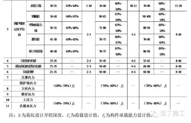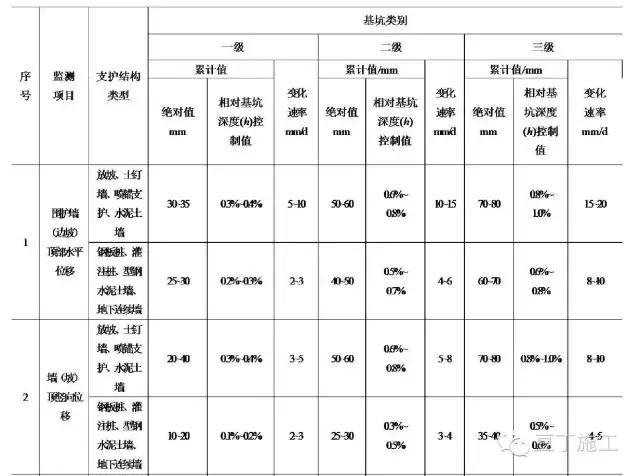 基坑及支护结构监测报警值(表格出自建筑基坑工程监测技术规范(GB50497))