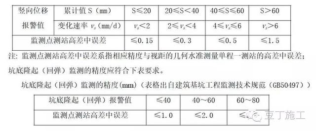 围护墙(边坡)顶部、立柱、基坑周边地表、管线和邻近建筑的竖向位移监测精度应根据竖向位移报警值按下表确定。