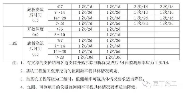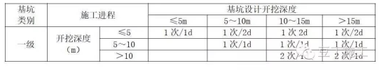 现场仪器监测的监测频率(表格出自建筑基坑工程监测技术规范(GB50497))