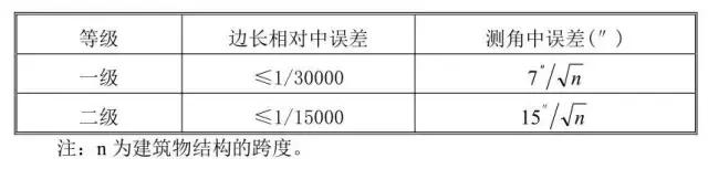 建筑物施工平面控制网,应根据建筑物的分布、结构、高度、基础埋深和机械设备传动的连接方式、生产工艺的连续程度,分别布设一级或二级网。一般钢结构、超高层、连续程度高的建筑宜布设成一级网,框架、高层、连续程度一般的建筑宜布设成二级网。其主要技术要求,应符合下表规定。