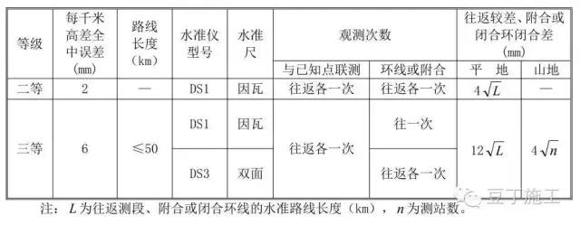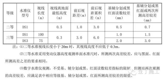 ⑶数字水准仪观测,不受基、辅分划或黑、红面读数较差指标的限制,但测站两次观测的高差较差,应满足表中相应等级基、辅分划或黑、红面所测高差较差的限值。