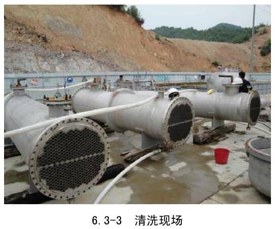 采用新型三合一清洗剂,主要使用循环清洗工艺、擦拭清洗工艺、浸泡清洗工艺进行清洗。循环清洗工艺应用于塔类设备、换热器类设备、管板式换热器的壳程以及U型管换热器的管程,擦拭清洗工艺应用于罐类设备、管板式换热器的管程,浸泡清洗工艺应用于泵类设备,不同类型设备进入相应清洗流程。清洗现场见图6.3-3。