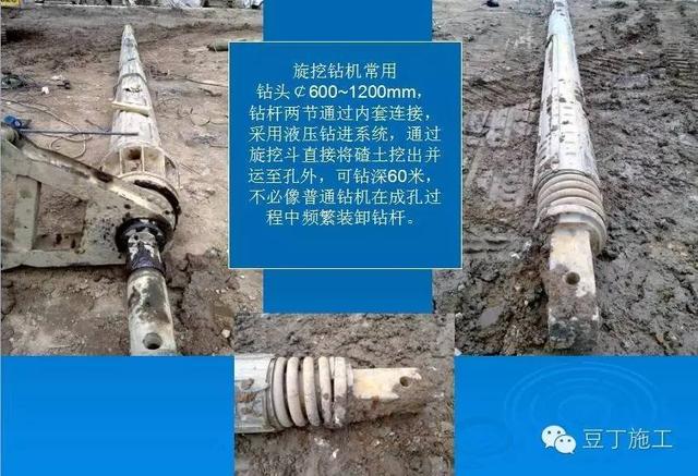 旋挖钻机常用钻头¢600~1200mm,钻杆两节通过内套连接,采用液压钻进系统,通过旋挖斗直接将碴土挖出并运至孔外,可钻深60米,不必像普通钻机在成孔过程中频繁装卸钻杆。