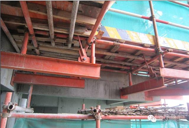其中每段悬挑脚手架的悬挑槽钢及卸荷钢丝绳待其上脚手架全部拆完,才开始拆除。