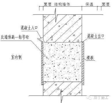 工艺流程:穿墙钢管或悬挑架型钢取出基层凿毛湿润两侧支模浇注混凝土两侧拆模凿除凸出砼外侧刷JS 防水外墙保温及装饰面层施工。