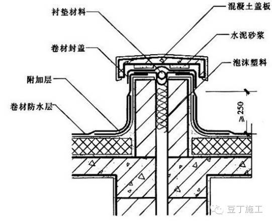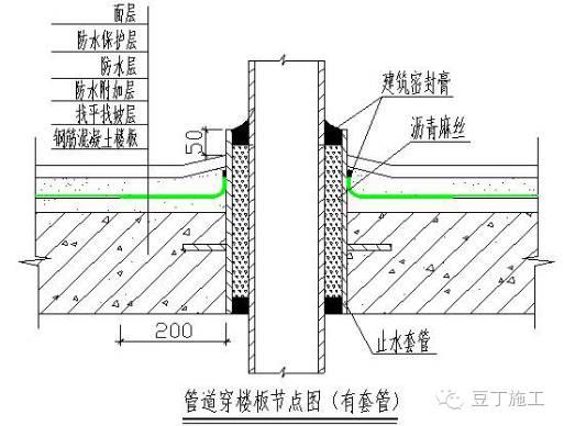 工艺流程:基层清理管周附加防水层屋面防水层保温层和刚性保护层沥青麻丝塞缝抹灰保护层打密封油膏。