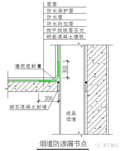 工艺流程:检查洞口基层处理安装烟风道堵塞孔洞闭水试验打密封膏找平找坡防水附加层防水层闭水试验防水保护层饰面层闭水试验。
