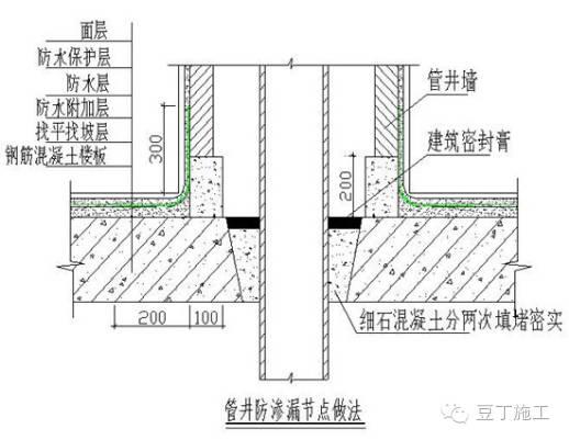工艺流程:基层处理侧排口、管周等部位封堵找平找坡层防水附加层防水层闭水试验防水保护层沉箱内管道安装侧排口裹无纺布保护室内立管周浇细石混凝土陶粒混凝土层找平找坡层防水层闭水试验防水保护层饰面层闭水试验。