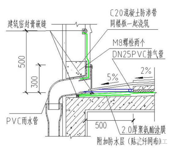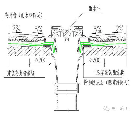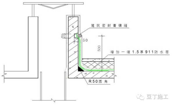 4.防水涂膜施工前,应对屋面阴阳角、天沟、檐口、水落口、变形缝、分割缝、出屋面设施底部、上人口等节点处进行附加增强处理(增加一层2.0厚911防水涂膜)。