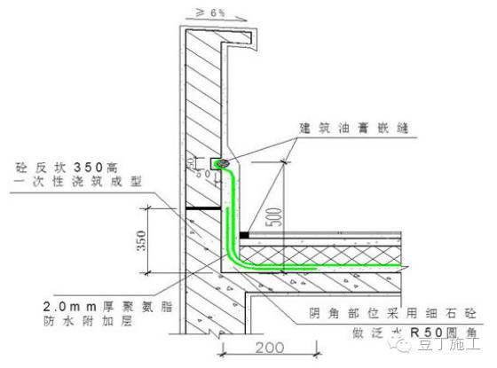 屋面砼必须一次浇筑完成,女儿墙和高出屋面的水箱间、机房、楼梯间等与屋面砼接触处的砼必须高出屋面板100~200mm,并与屋面板同时浇灌,阻止水从该处渗漏。找平层抹灰时在阴阳角转角处用圆角抹子抹100mm半径圆弧,然后二次收光。