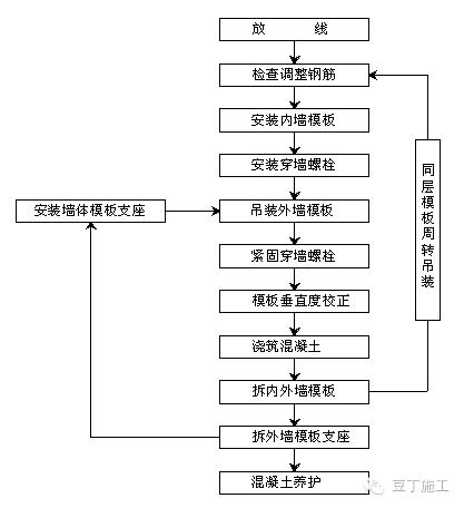 弹出墙体位置线安装洞口模板安装墙体模板安装对拉螺栓安装斜撑墙体模板固定。