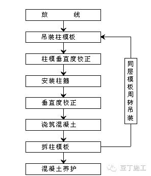搭设安装架子吊装组拼柱模检查对角线、垂直度和位置安装柱箍 安装有梁口的柱模板模板安装质量检查柱模固定。