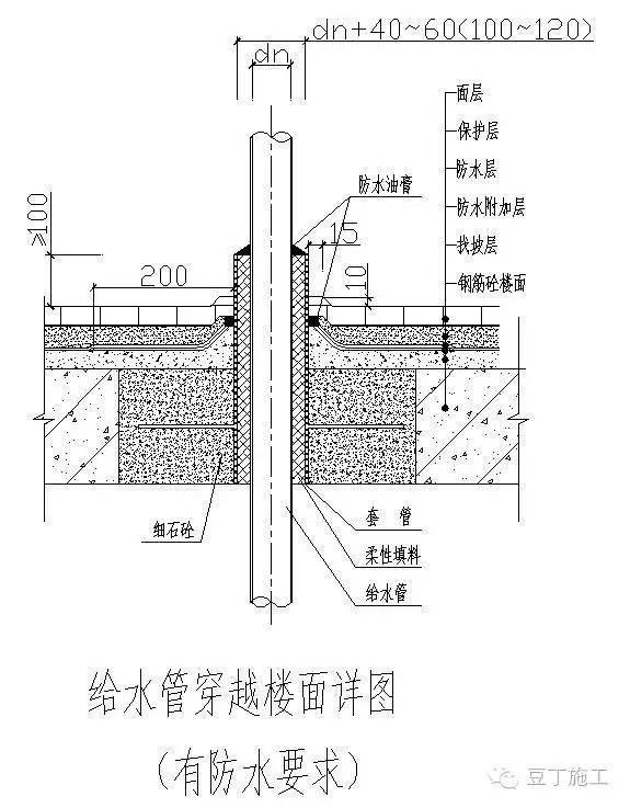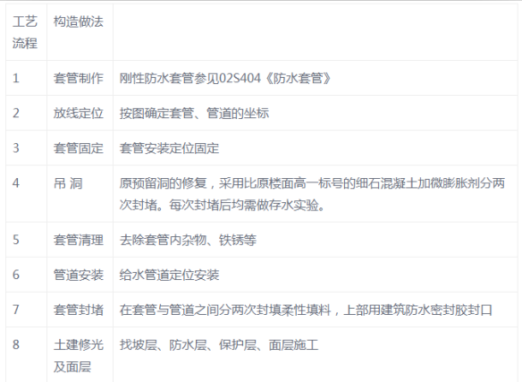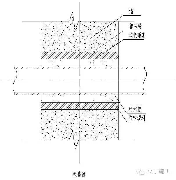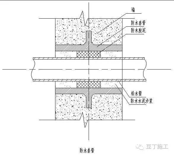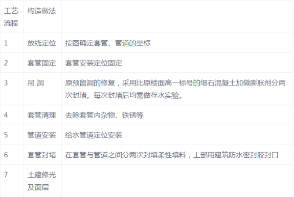穿墙给水管预留套管,给水管施工完成后,对套管与给水管之间的缝隙进行有效封堵