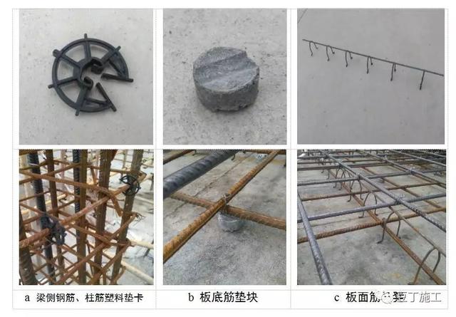 1)为有效保障钢筋保护层厚度、控制露筋现象,要求使用塑料垫块、通长钢筋马凳;