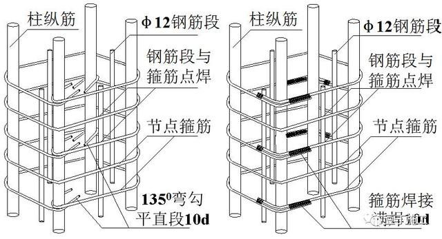 梁柱节点箍筋采用按下图预先点焊制成的箍筋笼,随绑扎后的梁筋一齐下沉至设计位置,保障柱头箍筋的位置、间距。