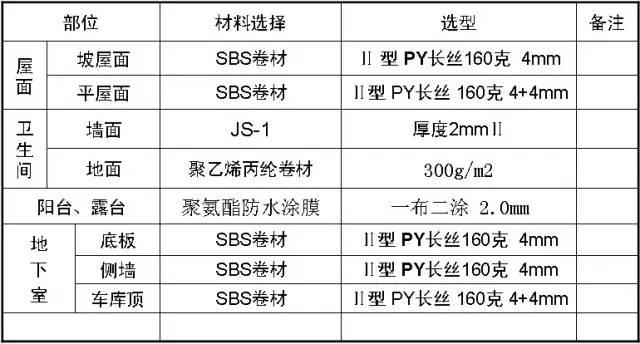 二、主要防水材料选用表