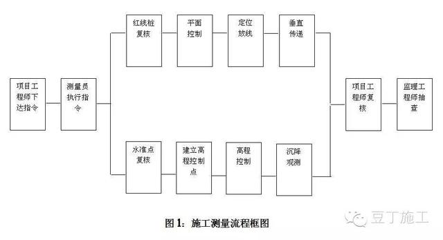 建筑物定位按设计图纸,以已知的坐标点为依据,先放出主控轴线,并经上述图1 流程反复测量和复核,放出其余各轴,设置好龙门桩,标出各轴线,并由建设、监理方和有关部门签证后为准。放样的同时,应做好主控轴线标桩的设置。