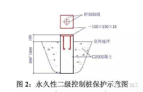 本工程拟选择3、10、16、20、H 轴为地下室主控轴线,建立控制网,按规定做好标桩,以作为二级控制桩,并加以保护,以确保测量工作自始至终的一致性和准确性。二级控制桩的设置位置应与施工总平面图相配合。现场根据一级控制桩引出二级控制桩,在不易受土体扰动和施工影响的位置设置永久性二级控制桩,对永久性桩加以保护。永久性二级控制桩保护示意见图