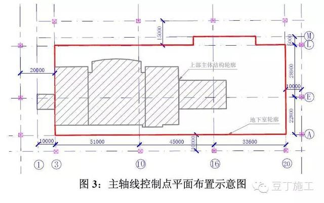 为有效地控制上部结构轴线,0.00 以上各层建筑的轴线全部利用天顶倒锤体原理采用内控法进行垂直传递。