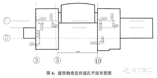上部结构垂直传递孔平面位置详见图4 建筑物垂直传递孔平面布置图。应注意,图中标示的是相应轴线至垂直传递孔中心位置的距离。