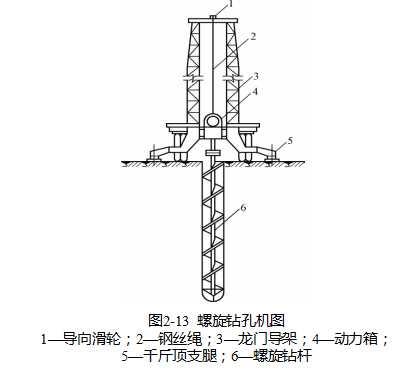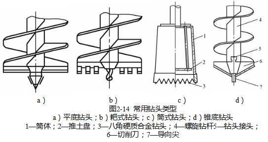 螺旋钻孔机由动力箱、钢丝绳、螺旋钻杆、龙门导架及钻头等组成,如图2-13所示。常用钻头类型有平底钻头、耙式钻头、筒式钻头和锥底钻头四种,如图2-14所示。