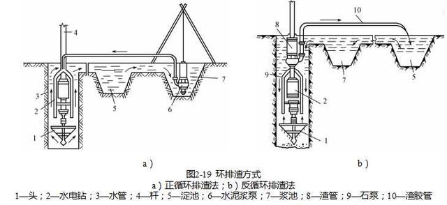 钻削下来的土屑混合进护壁泥浆后,通过泥浆循环流动被带出孔外。泥浆循环流动方式有正循环和反循环两种。正循环排泥法。如图2-19a所示,反循环排泥法。如图2-19b所示。