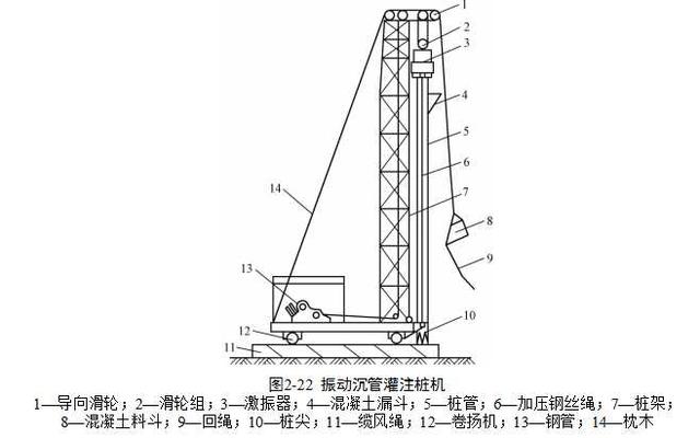 (1)施工机械设备。振动沉管灌注桩是采用激振器或振动冲击锤将桩管沉入土中成孔而成的灌注桩。其施工机械设备如图2-22所示。