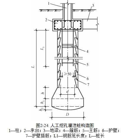 人工挖孔灌注桩系指在设计桩位处采用人工挖掘方法进行成孔,然后安放钢筋笼、灌注混凝土所形成的桩。其施工特点是:设备简单;成孔作业时无噪音和振动,无挤土现象;施工速度快,可同时开挖若干个桩孔;挖孔时,可直接观察土层变化情况,孔底沉渣清除彻底,施工质量可靠。但施工时人工消耗量大,安全操作条件差。人工挖孔灌注桩构造如图2-24所示。