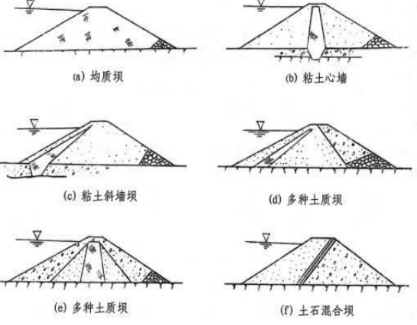 1、均质坝。坝体断面不分防渗体和坝壳,基本上是由均一的黏性土料(壤土、砂壤土)筑成。