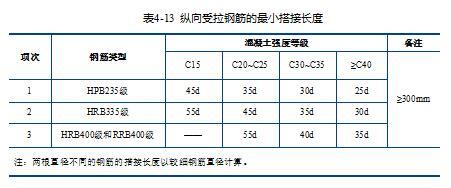 纵向受拉钢筋的最小搭接长度见表4-13。