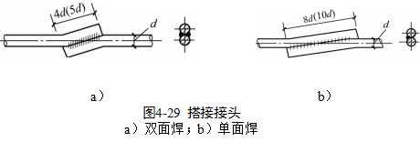 (1)搭接焊。适用于直径10~40 mm的HPB235~HRB400钢筋。搭接接头钢筋应先预弯,以保证两极钢筋的轴线在一条直线上。焊接时,宜采用双面焊,如图4-29a所示,不能进行双面焊时也可采用单面焊,如图4-29b所示。