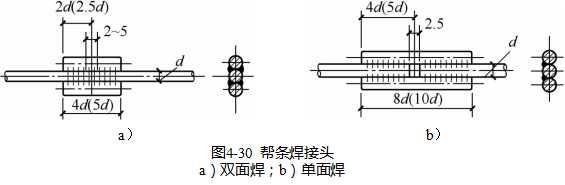 (2)帮条焊。适用于直径大于10 mm的HPB235~RRB400钢筋。焊接时,宜采用双面焊,如图4-31a所示,不能进行双面焊时也可采用单面焊,如图4-30b所示。