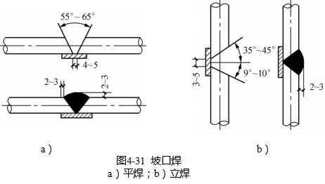 (3)坡口焊。坡口接头多用于在施工现场焊接装配式结构接头处钢筋,分为平焊和立焊,如图4-31所示。施焊前先将钢筋端部制成坡口。钢筋坡口平焊采用V形坡口,坡口夹角在60左右,如图4-31a所示。两根钢筋间的空隙为3~5 mm,下垫钢板,然后施焊。钢筋坡口立焊采用35~45坡口,如图4-31b所示。