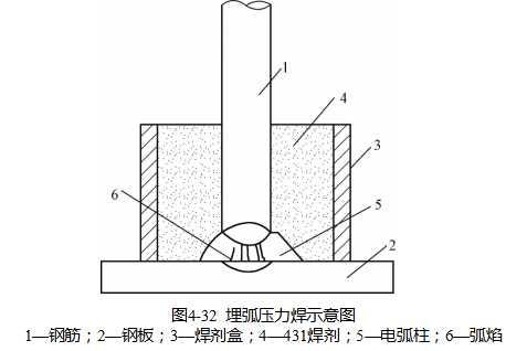 埋弧压力焊是利用焊剂层下的电弧,将两焊件相邻部位熔化,然后加压顶锻使两焊件焊合,如图4-33所示。其具有焊后钢板变形小、抗拉强度高的特点,多用于钢筋与钢板丁字型接头的焊接。