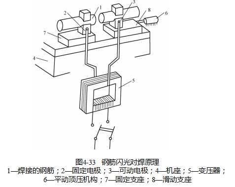 闪光对焊的原理如图4-32所示。通电后,两钢筋轻微接触,通过低电压的强电流,当钢筋加热到接近熔点时,施加顶锻,使两根钢筋焊接在一起,形成对焊接头。