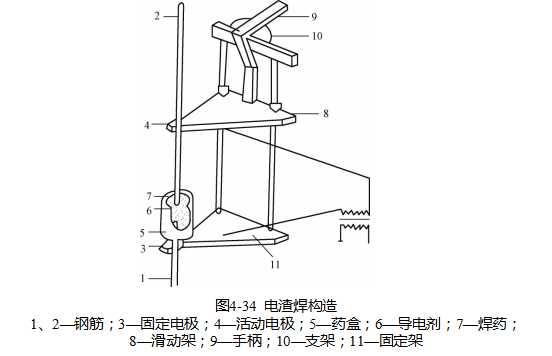 电渣压力焊是利用电流通过渣池产生的电阻热将钢筋端部熔化,然后施加压力使钢筋焊合。这种方法多用于现浇钢筋混凝土结构竖向钢筋的接长,比电弧焊功效高、成本低,易于掌握。钢筋电渣压力焊分手工操作和自动控制两种。采用自动电渣压力焊时,主要设备是自动电渣焊机,电渣焊构造如图4-34所示。