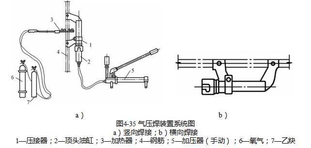 钢筋气压焊是利用乙炔、氧气混合气体燃烧的高温火焰,加热钢筋结合端部,不待钢筋熔融使其高温下加压接合。这种方法具有设备简单、工效高、成本低等优点,适用于各种位置的钢筋焊接。气压焊的设备包括供气装置、加热器、加压器和压接器等(图3-35)。