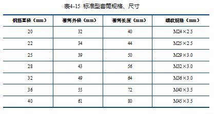 为充分发挥钢筋母材强度,连接套筒的设计强度大于等于钢筋抗拉强度标准值的1.2倍,直螺纹接头标准套筒的规格、尺寸如表4-15所示。