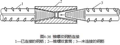 锥螺纹连接是用锥形纹套筒将两根钢筋端头对接在一起,利用螺纹的机械咬合力传递拉力或压力。所用的设备主要是套丝机,通常安放在现场对钢筋端头进行套丝,如图4-36所示。