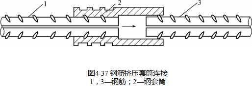 套筒挤压连接是把两根待接钢筋的端头先插入一个优质钢套管,然后用挤压机在侧向加压数道,套筒塑性变形后即与带肋钢筋紧密咬合达到连接的目的,如图4-37所示。