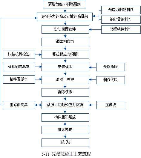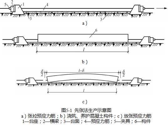 工艺过程:张拉固定预应力筋浇筑混凝土养护(至75%强度)放张预应力筋。