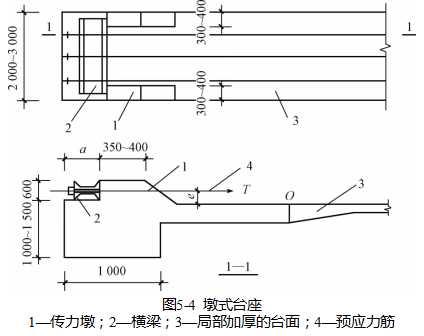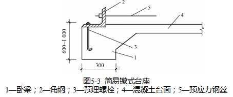 以混凝土墩作承力结构的台座称墩式台座,一般用于平卧生产的中小型构件,如屋架、空心板和平板等。生产空心板、平板等平面布筋的混凝土构件时,由于张力不大,可利用简易墩式台座,如图5-2所示。生产中型构件或多层叠浇构件时,多用如图5-3所示的墩式台座,台座局部加厚,以承受部分张拉力。墩式台座是由传力墩、台面、横梁组成。